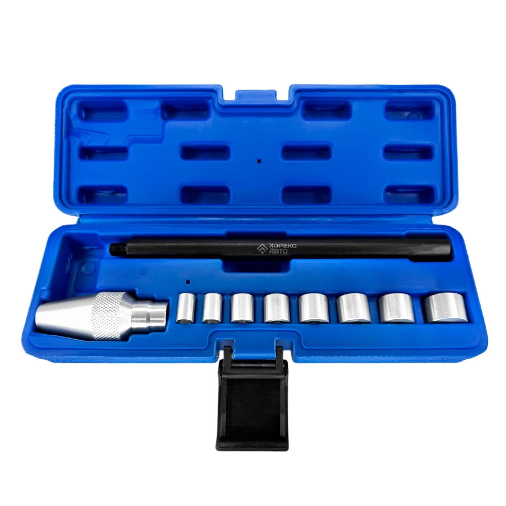 В комплект входят набор втулок разных диаметров, рукоятка длиной 230 мм, конус с диапазоном 19,5–30 мм и удобный пластиковый кейс — всё для эффективной работы в автосервисе.