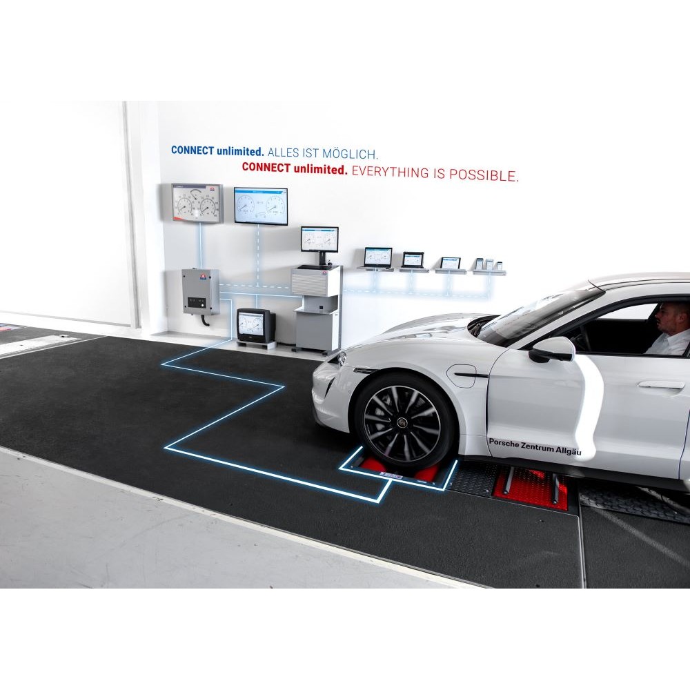 Цифровой роликовый тормозной стенд для легковых автомобилей и микроавтобусов с осевой нагрузкой до 3,5 т, с приводными двигателями 2 x 3 кВт и макс. ширина колеи 2200 мм.